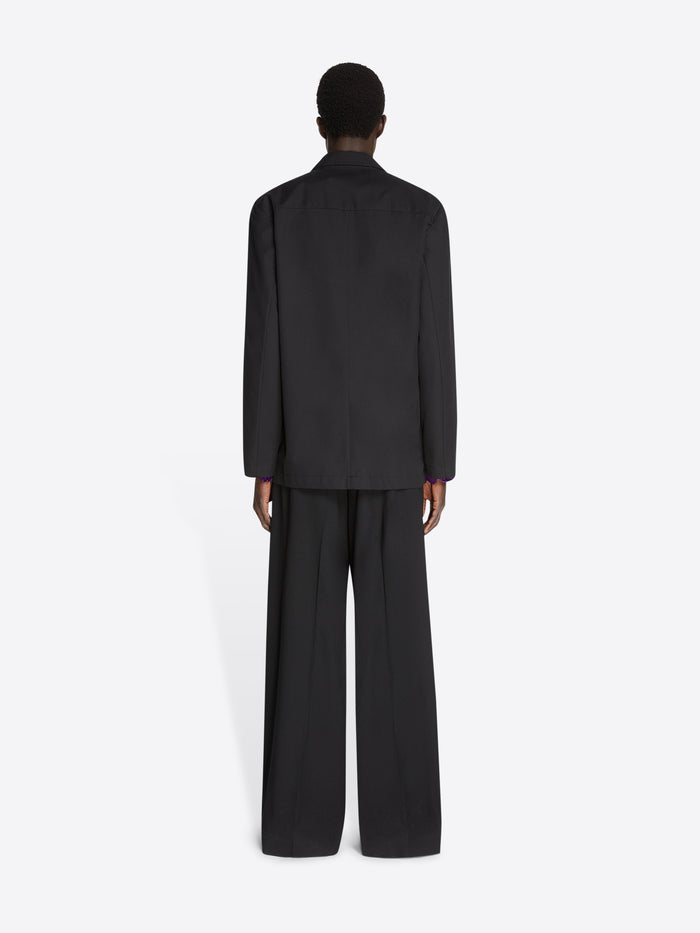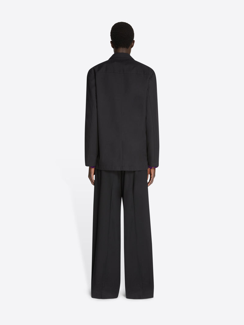 Loose fit. Peak lapel. Double-breasted. Side slit pockets. Front button closure.