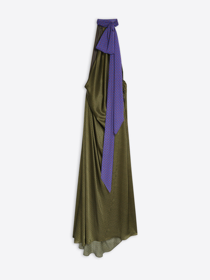 Floor-length halterneck evening dress in silk satin, with neck scarf and Tie print.