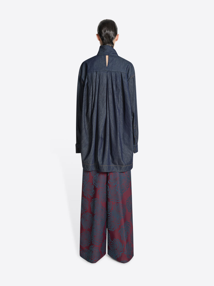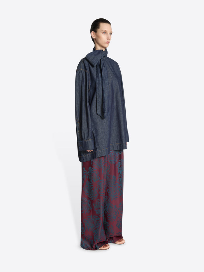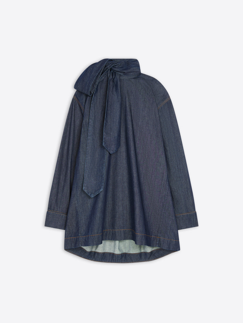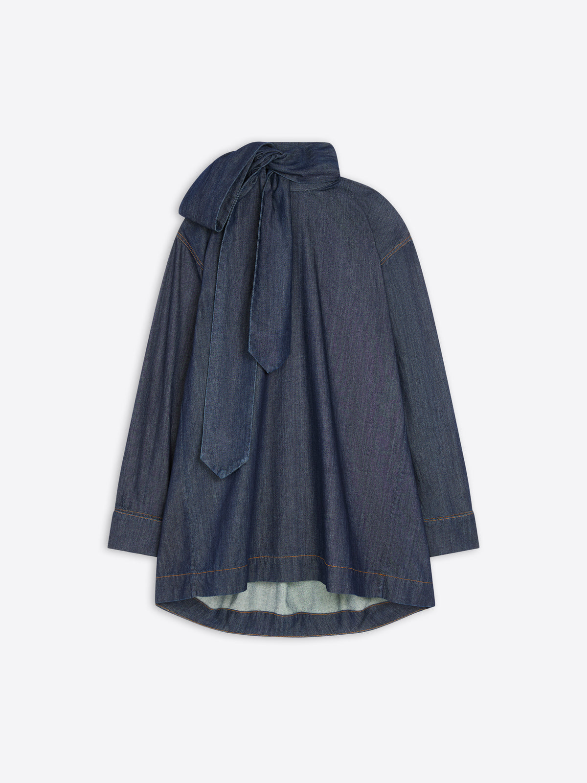 Loose fit blouse with back pussy-bow collar and pleats, in lightweight indigo denim.