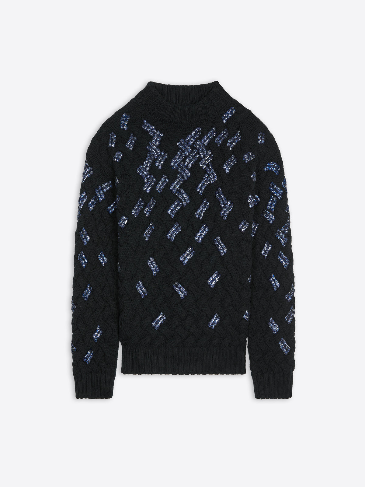 Loose fit. Mock turtleneck collar.