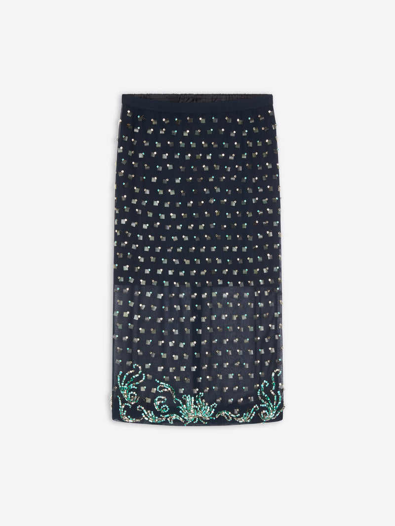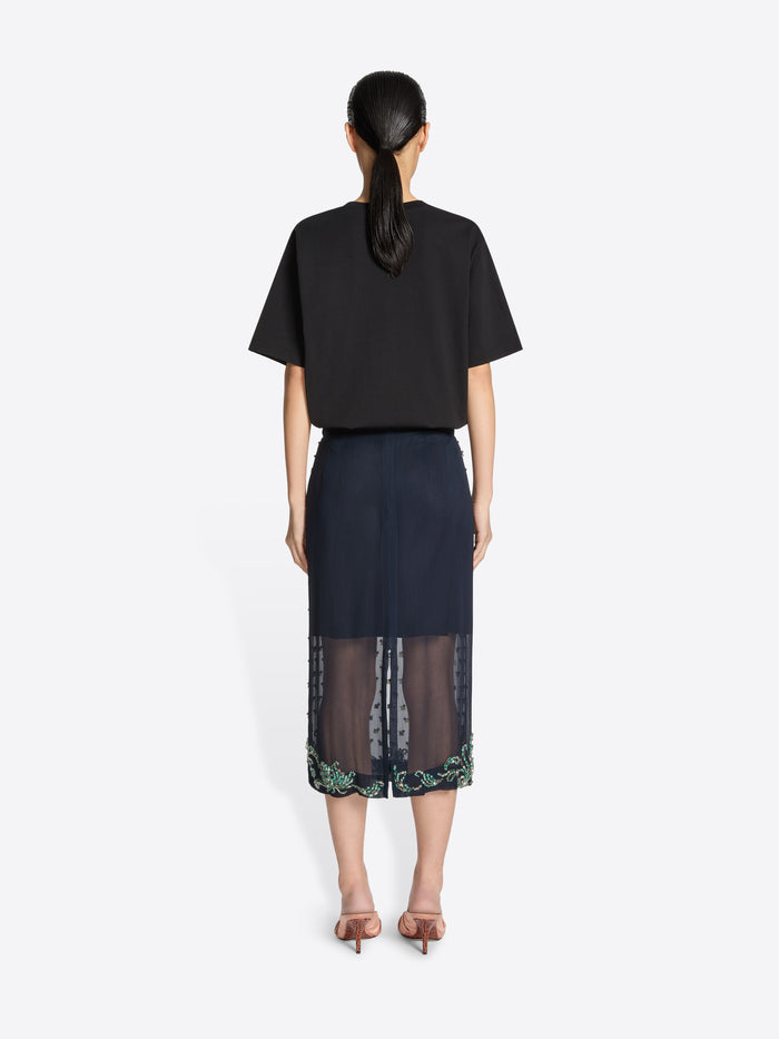 Regular fit. Mid rise. Mini length with knee length overlayer. Back slit. Back zip closure.