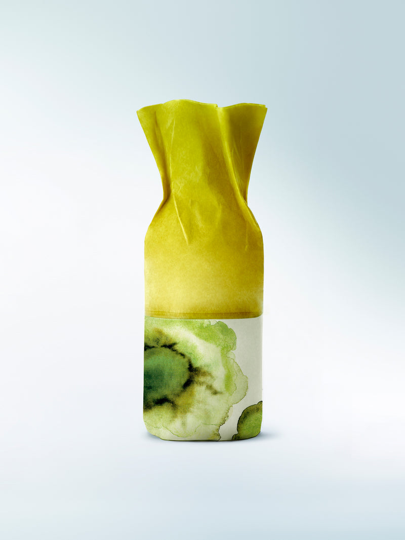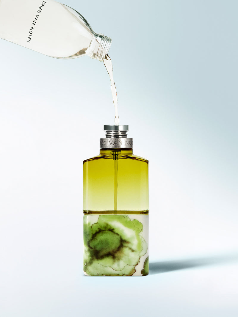 A dual expression of fashion and art, the bottle fuses deep green glass and precious porcelain patterned with poetic, watercolour-style flowers as though lifted from a painting.