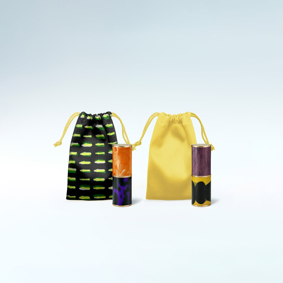 Lipstick shades purchased with a case are slipped into in a reusable drawstring pouch, available in a selection of house designs (one pouch per order).