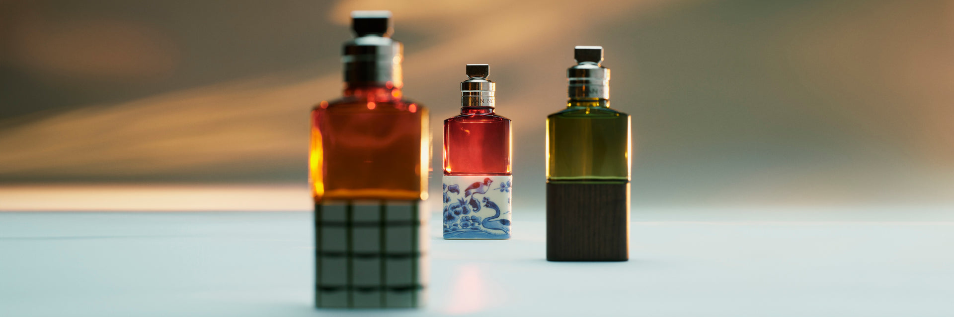Perfume bottle with gold cap and orange liquid, accompanied by a decorative drawstring bag on a light blue background.