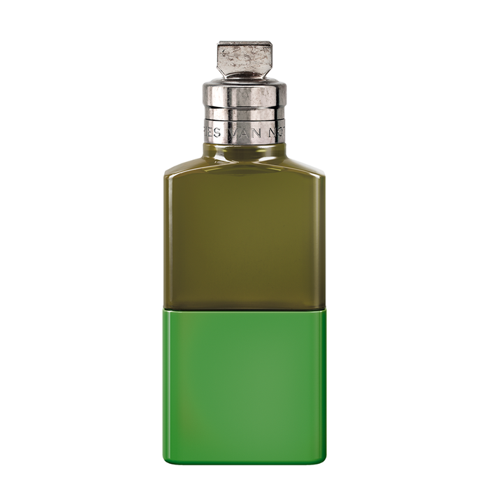 Avec une intensité chromatique et affirmant la maîtrise de la couleur propre à Dries Van Noten, le flacon arbore un duo minimaliste de verts, clairs et froids, chauds et saturés.