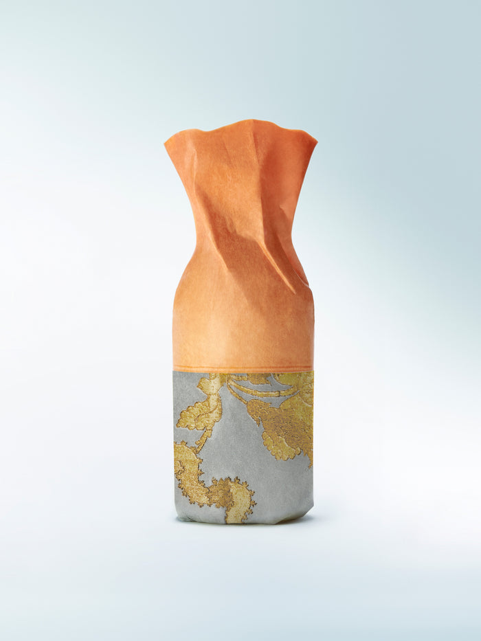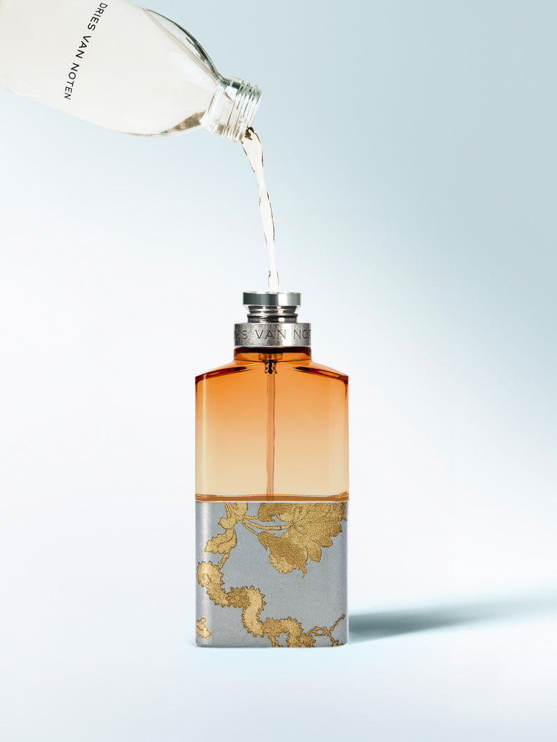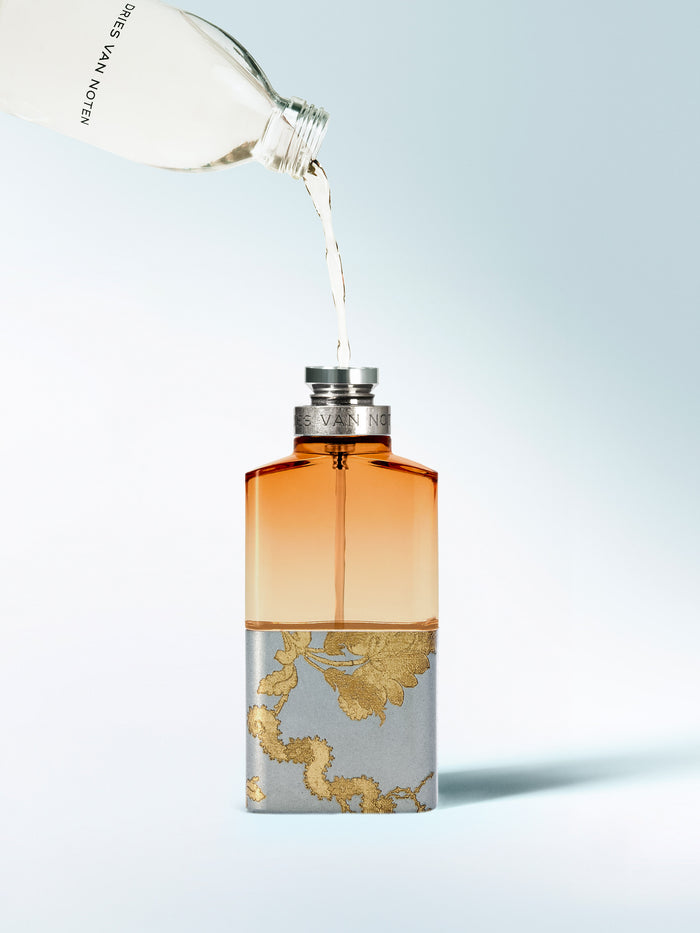 Le flacon associe le verre rose poudré et le métal brossé recouvert d'un motif inspiré du brocart d'or.
