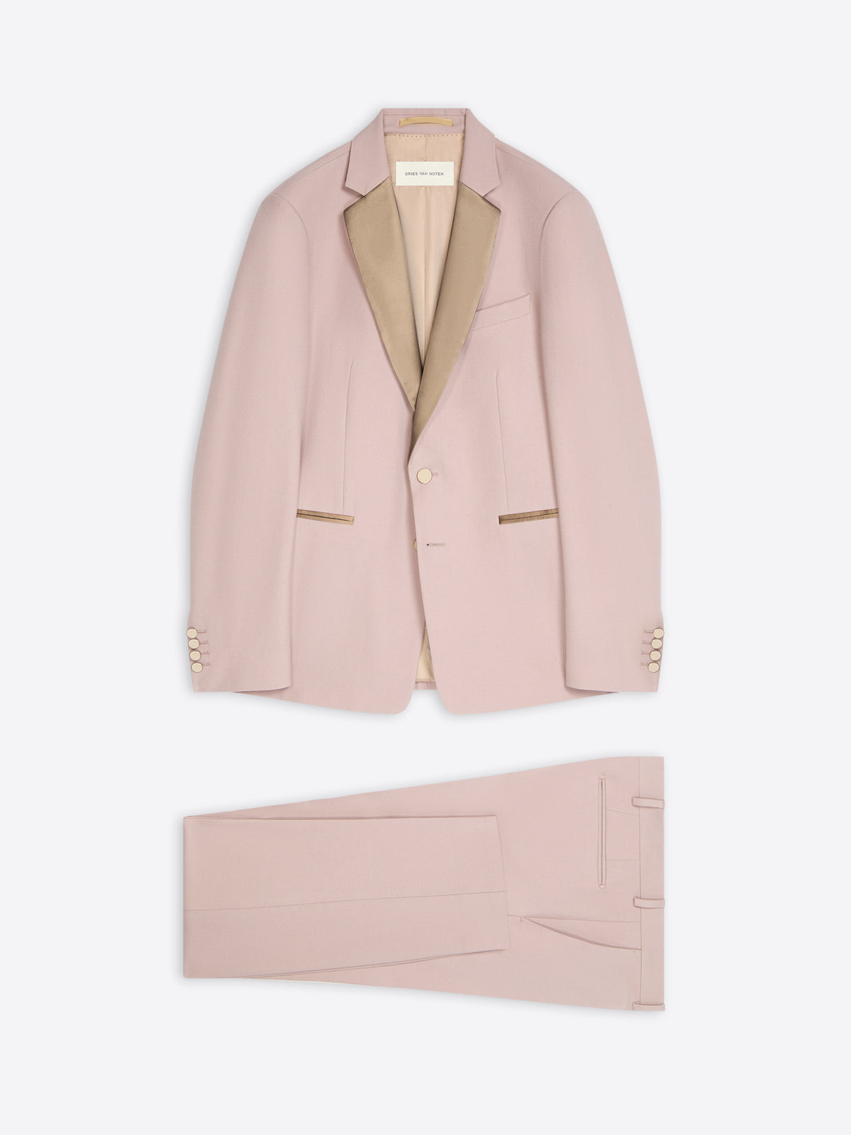 Man wearing a light lilac, woolen slim fit tuxedo and purple patterned tie on a white background