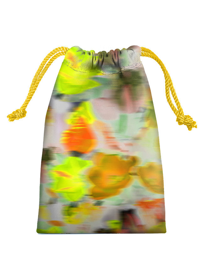 Perfume bottle with gold cap and orange liquid, accompanied by a decorative drawstring bag on a light blue background.