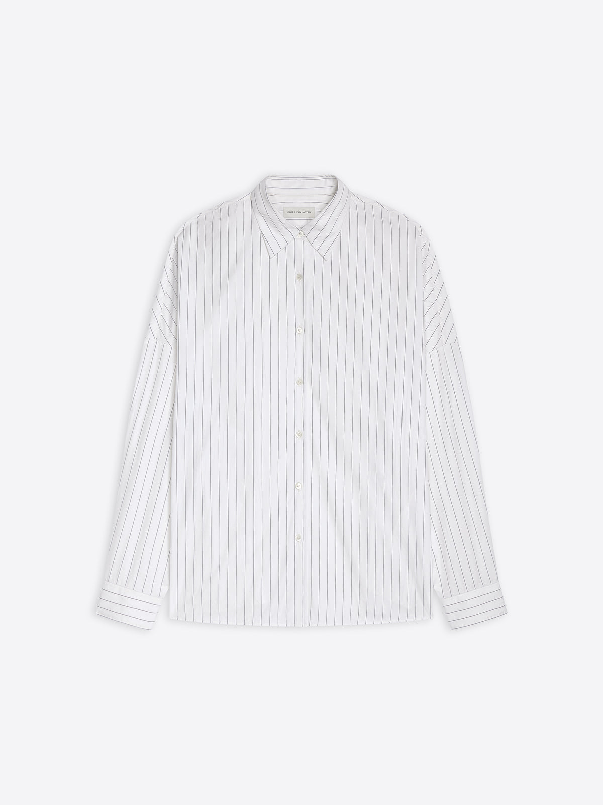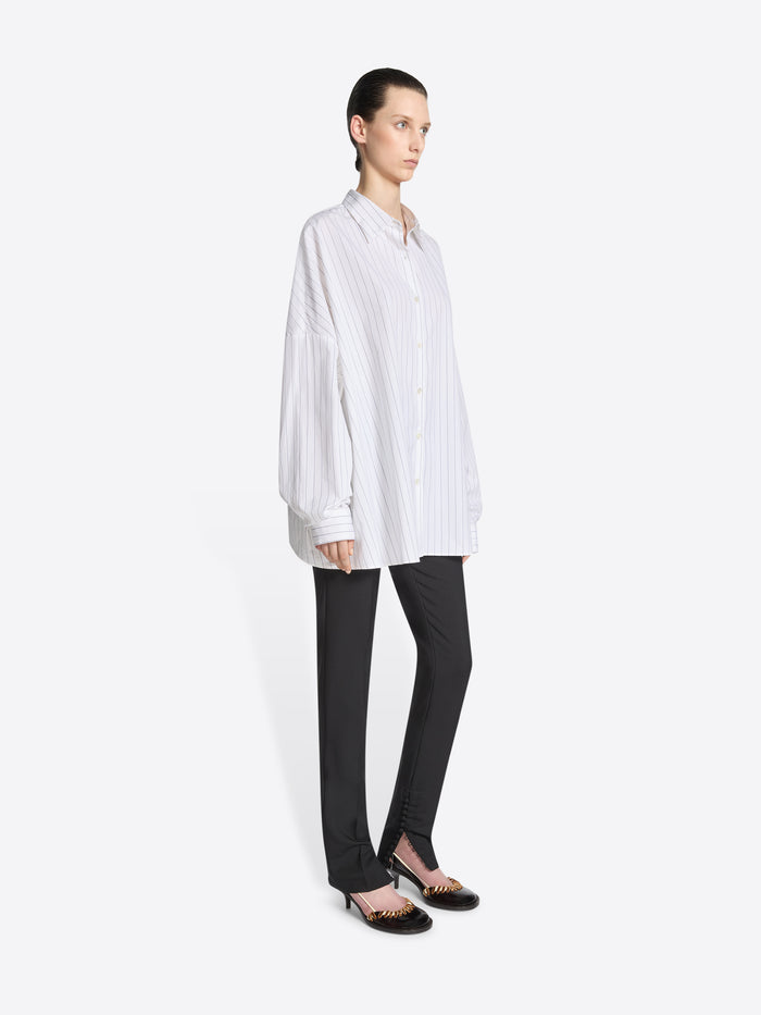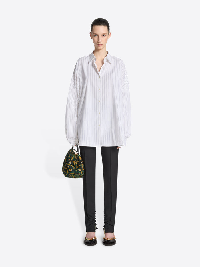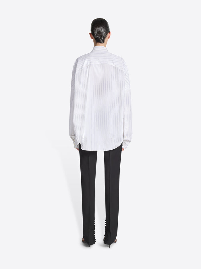 White cotton cocoon shirt with thin black stripes on a white background