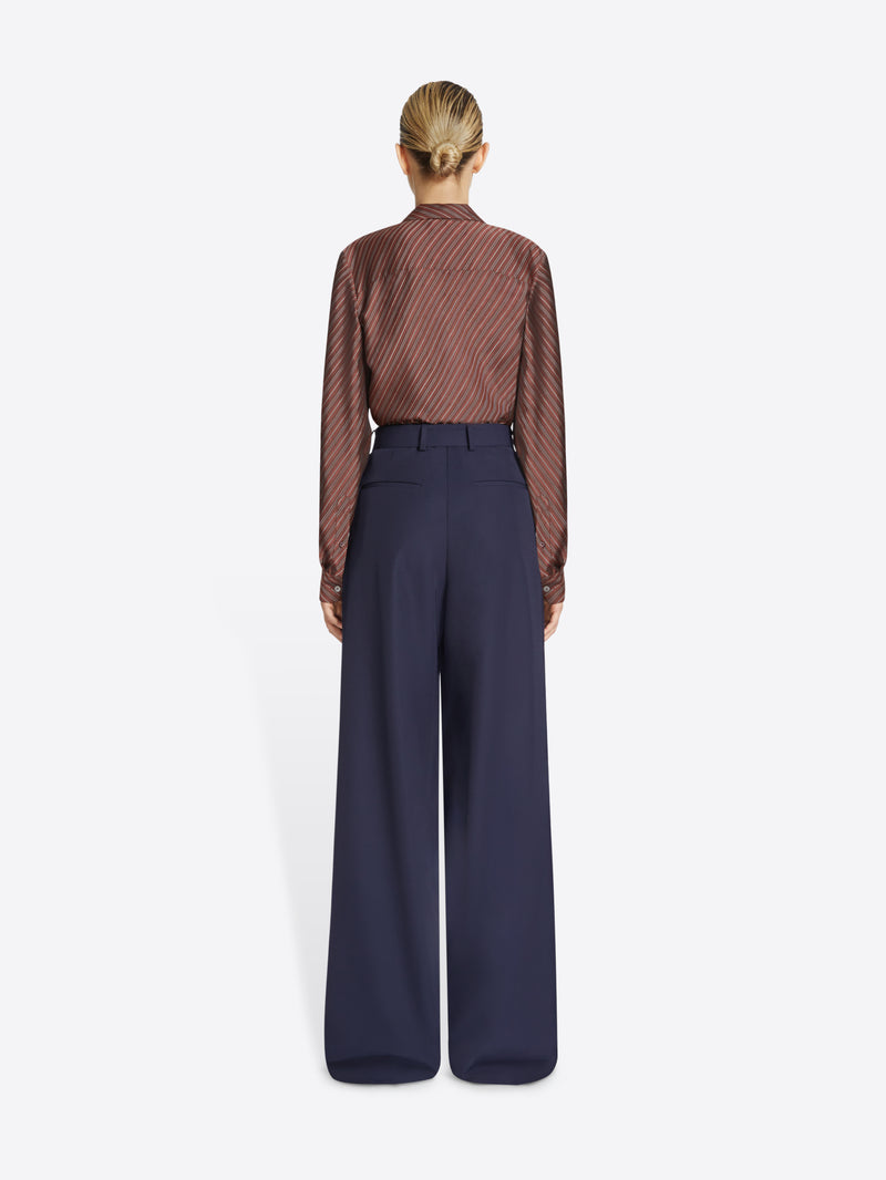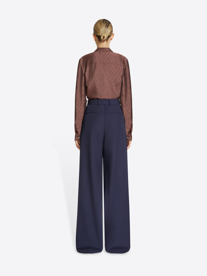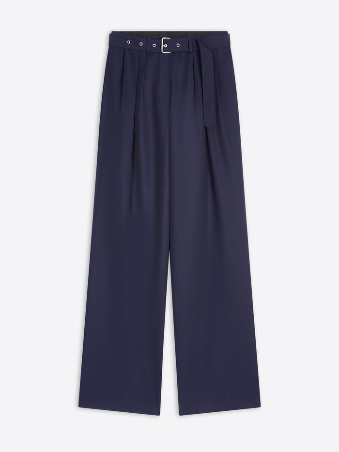 Ruimvallende pasvorm. Rechte pijp. Bandplooien. Steekzakken opzij en paspelzakken achter. Riem. Sluiting voor.