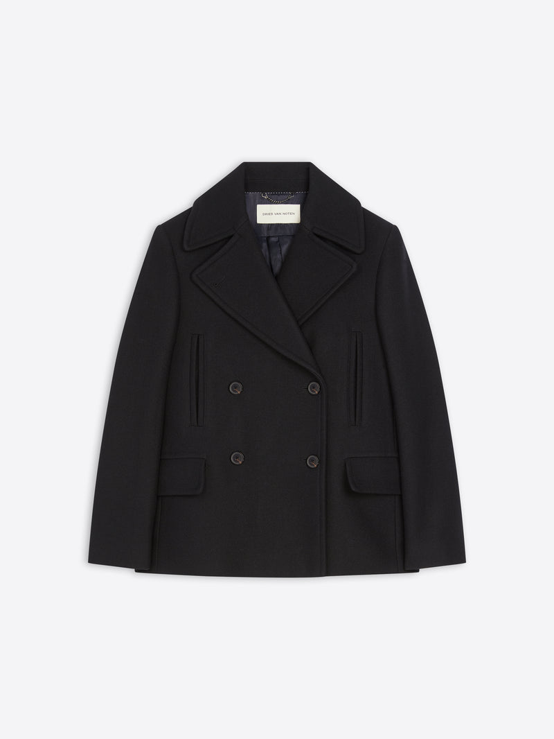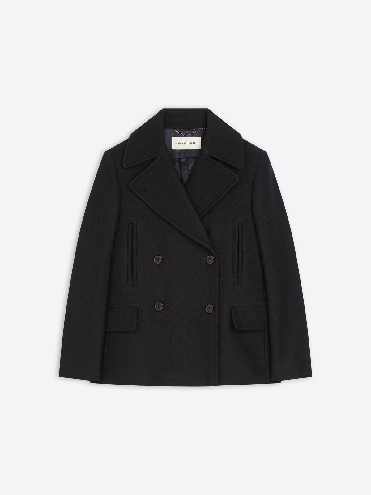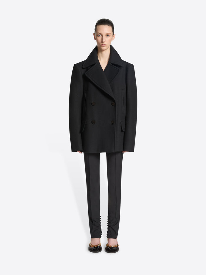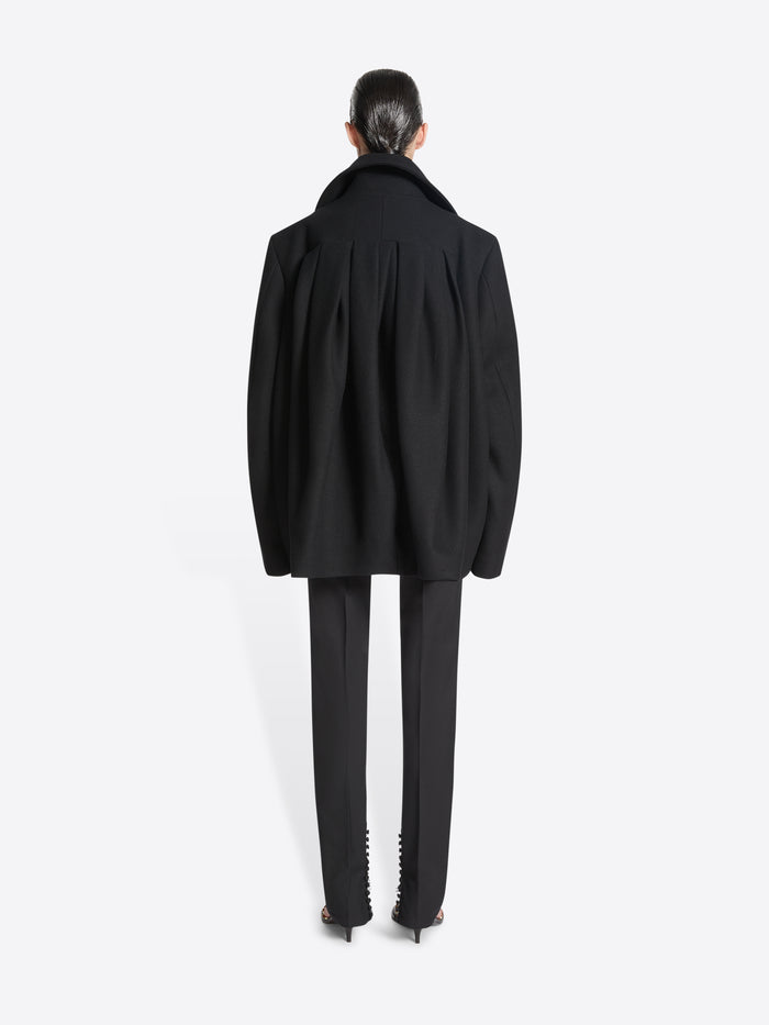 Oversized fit. Double-breasted. Front flap pockets. Back box pleat. Front button closure.